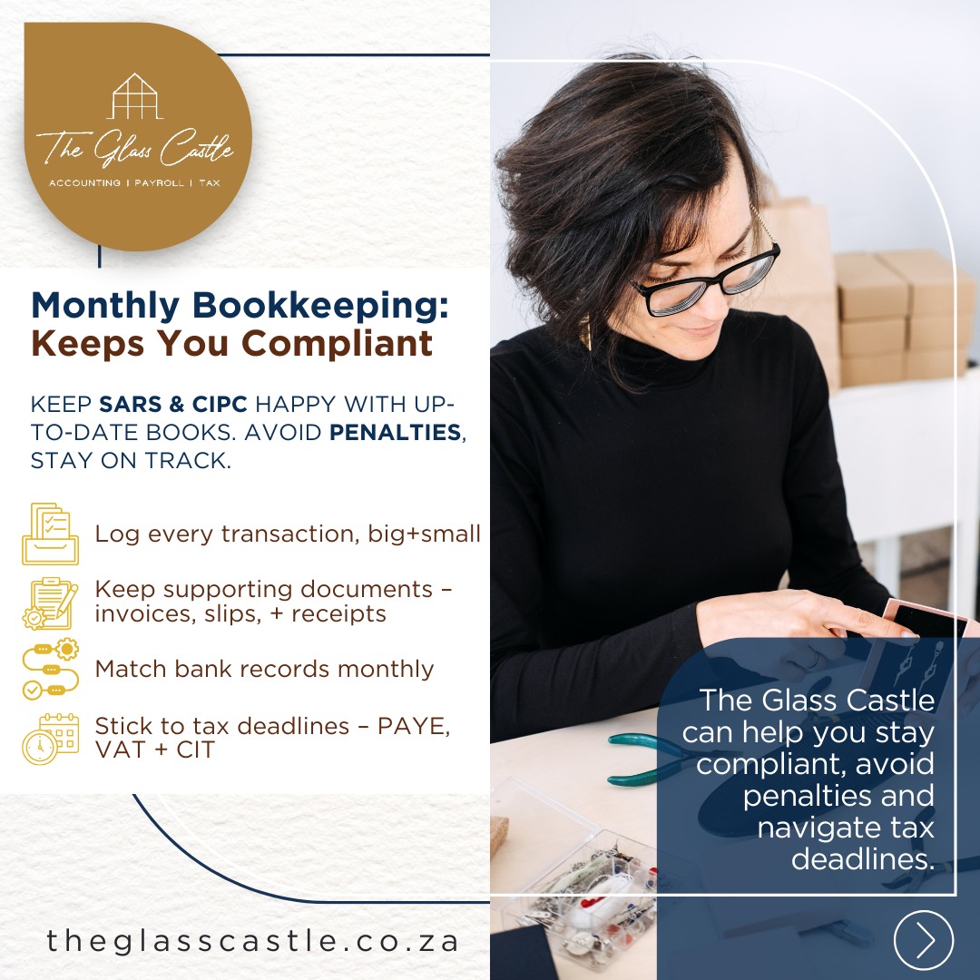 Business registrations, Tax compliance , VAT, PAYE, UIF, Accounting, Independent review, Business valuations, Business structuring. Bookkeeping, CIPC secretarial services.